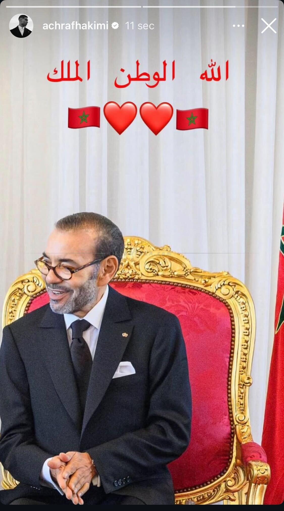 ونشر حكيمي "ستوري" عبر حسابه على "إنستغرام"، لصورة الملك محمد السادس، وعلق عليها بعبارة: "الله الوطن الملك".