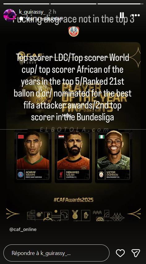 وكتب كامبا، في "ستوري" نشره عبر حسابه الرسمي على "إنستغرام": "إنها فضيحة عدم تواجده (غيراسي) في طوب 3. غيراسي هو هداف دوري أبطال أوروبا، وهداف كأس العالم للأندية، وأفضل هداف أفريقي خلال 2025، واحتل المركز 21 في جائزة الكرة الذهبية، ومرشح ضمن أفضل المهاجمين في الفيفا، وثاني أفضل هداف في الدوري الألماني".