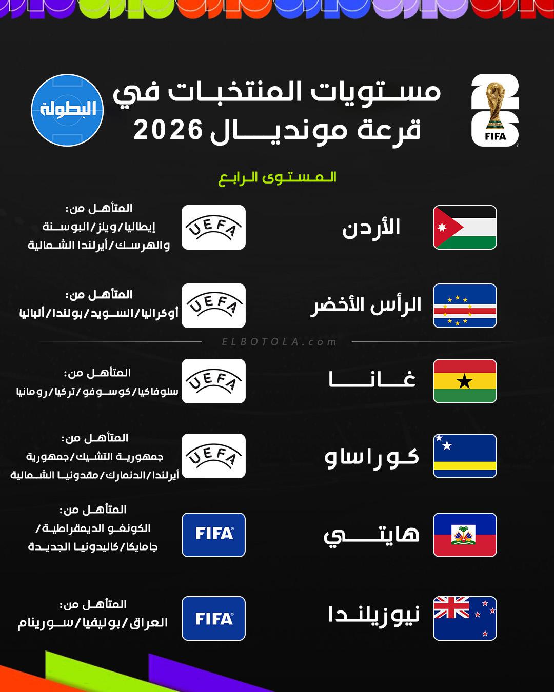 * المستوى الرابع: الأردن - الرأس الأخضر - غانا - كوراساو - هايتي - نيوزيلندا - المنتخبات المتأهلة عبر الملحق الأوروبي (4) المنتخبات المتأهلة عبر الملحق العالمي (2)