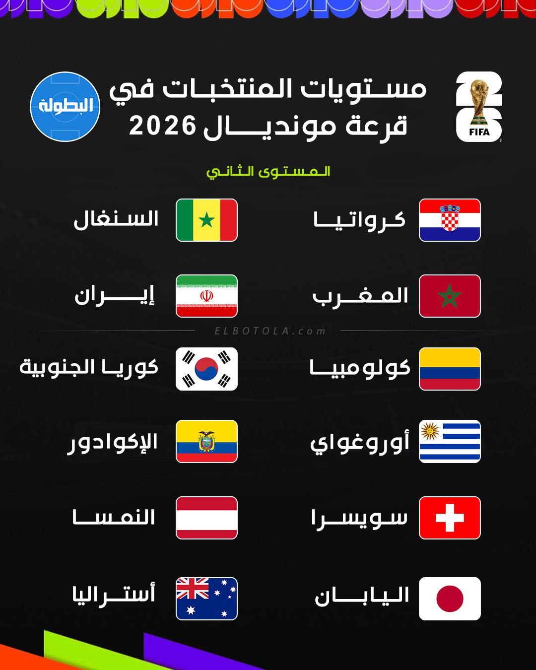 * المستوى الثاني: المغرب - كرواتيا - السنغال - إيران - أوروغواي - كولومبيا - كوريا الجنوبية - الإكوادور - سويسرا - النمسا - اليابان - أستراليا.