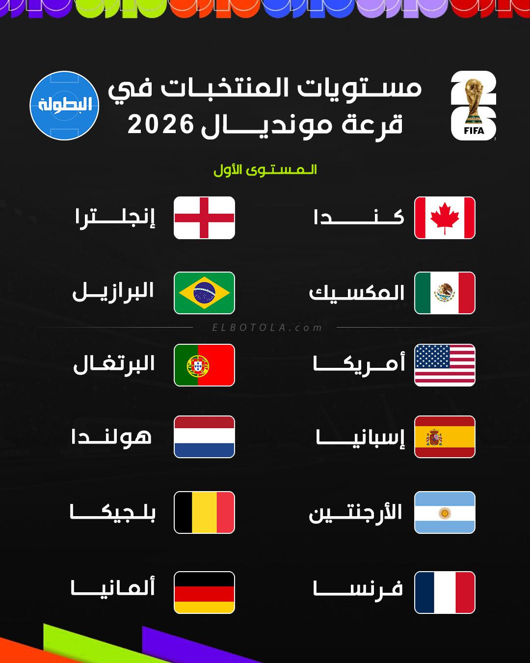 * المستوى الأول: أمريكا - المكسيك - كندا (الدول المستضيفة) - إسبانيا - الأرجنتين - فرنسا - البرازيل - إنجلترا - البرتغال - هولندا - بلجيكا - ألمانيا.