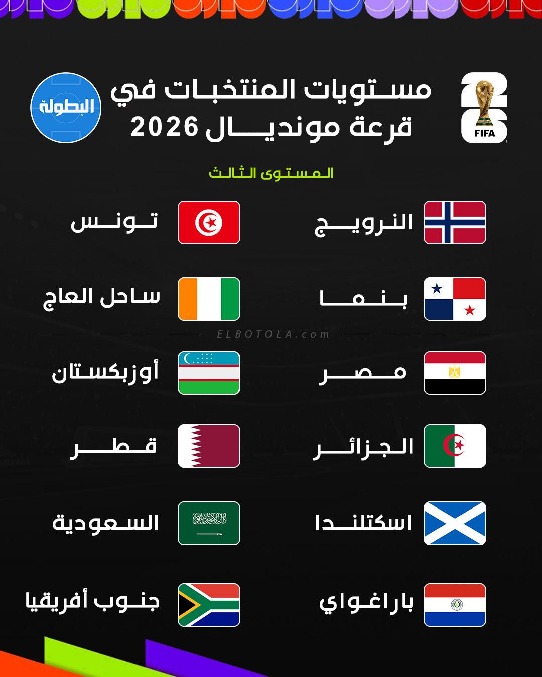 * المستوى الثالث: النرويج - بنما - ساحل العاج - أوزبكستان - أسكتلندا - باراغواي - جنوب أفريقيا - قطر - مصر - الجزائر - تونس - السعودية.