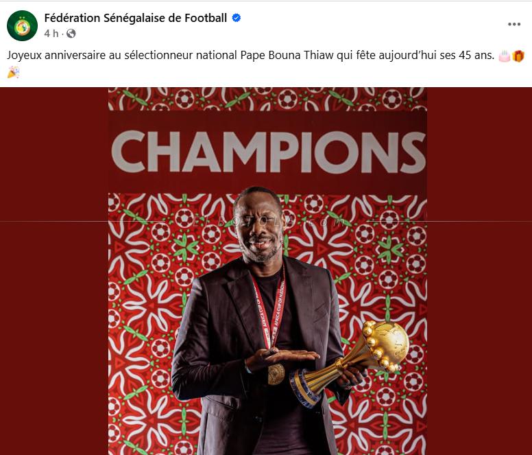 ونشر الحساب الرسمي للاتحاد منشور كتب فيه: "عيد ميلاد سعيد للمدرب الوطني باب بونا ثياو الذي يُكمل اليوم 45 عامًا".
