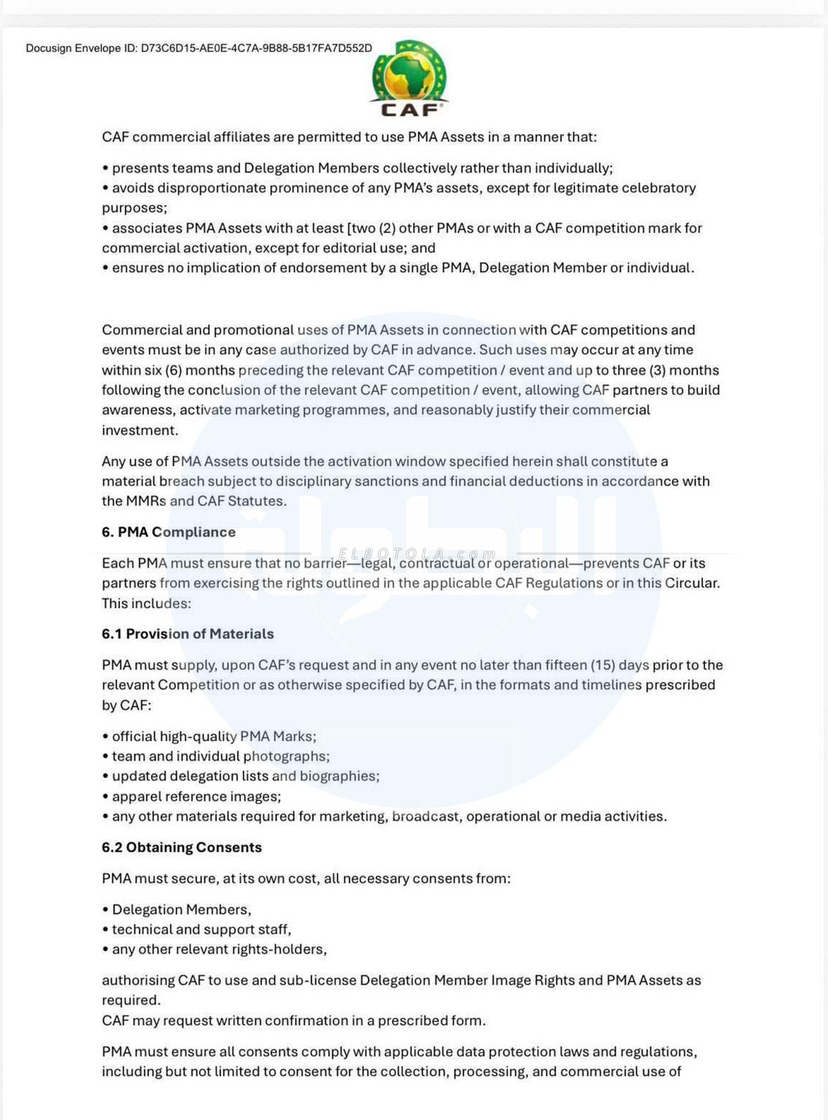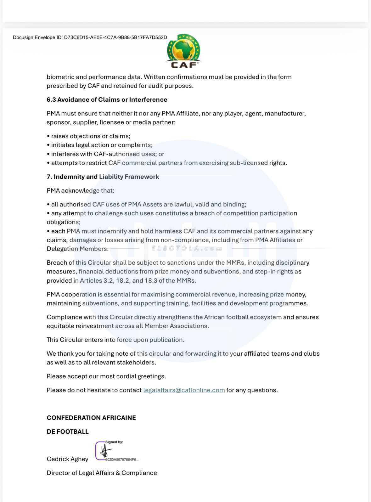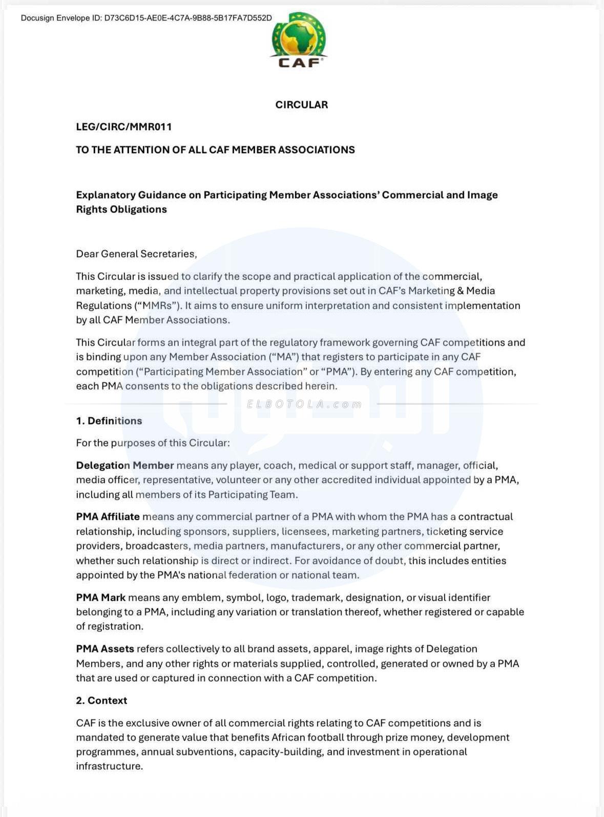 وأسل التوغولي سيدريك اغاي مدير الشؤون القانونية للاتحاد الافريقي لكرة القدم خطاباً الي كل الاتحادات الأعضاء، لتعميم التعليمات بشان الحقوق التجارية والتسويقية حيث يشمل التعميم لكل الاندية والاتحادات، أي لاعب أو مدرب أو طاقم طبي أو مدير أو مسؤول أو مسؤول إعلامي أو ممثل أو متطوع أو أي فرد معتمد آخر يعينه الاتحاد الوطني.