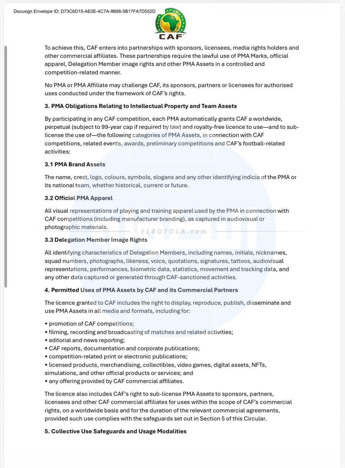 كما لا يجوز لأي جهة الطعن في الاتحاد الأفريقي لكرة القدم أو رعاته أو شركائه أو المرخص لهم بسبب الاستخدامات المصرح بها التي تتم في إطار حقوق الاتحاد الأفريقي لكرة القدم.