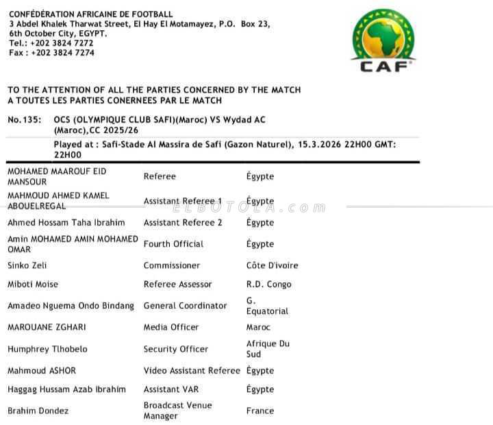 عينت لجنة التحكيم التابعة للاتحاد الأفريقي لكرة القدم طاقمًا تحكيميًا مصريًا لإدارة مباراة الديربي المغربي بين أولمبيك آسفي والوداد الرياضي، برسم ذهاب ربع نهائي بطولة كأس الكونفدرالية.