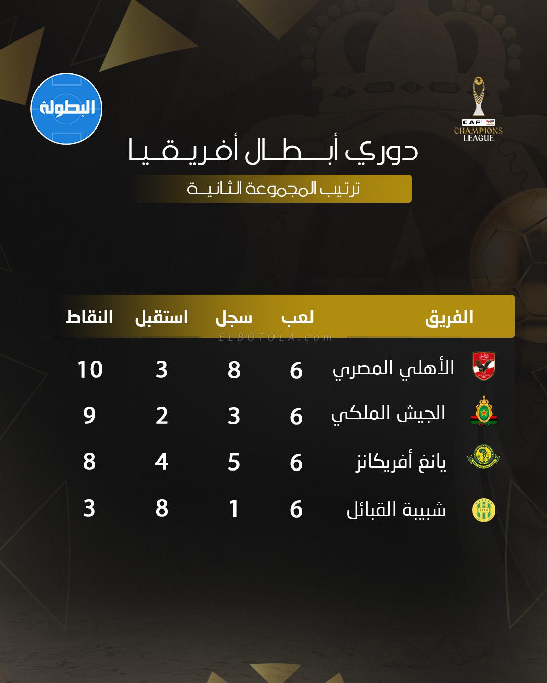 بلغ الجيش الملكي ربع نهائي دوري أبطال أفريقيا، بعدما أنهى دور المجموعات في المركز الثاني للمجموعة الثانية برصيد 9 نقاط، خلف الأهلي المتصدر. وحقق الفريق العسكري فوزين وثلاثة تعادلات مقابل هزيمة واحدة، مسجلاً 3 أهداف واستقبل هدفين فقط، في مشوار اتسم بالصلابة الدفاعية. وضمت المجموعة أيضاً كلاً من يونغ أفريكانز التنزاني وشبيبة القبائل الجزائري.