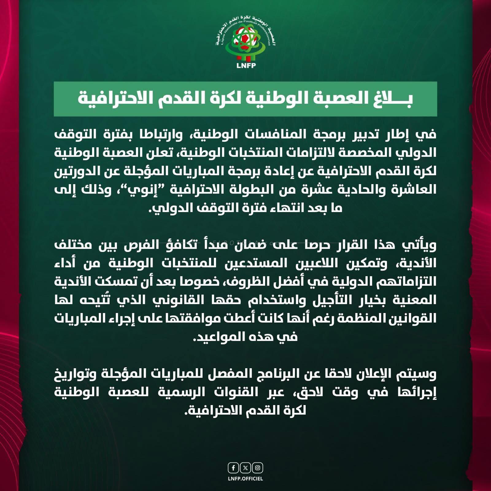 "في إطار تدبير برمجة المنافسات الوطنية، وارتباطا بفترة التوقف الدولي المخصصة لالتزامات المنتخبات الوطنية، تعلن العصبة الوطنية لكرة القدم الاحترافية عن إعادة برمجة المباريات المؤجلة عن الدورتين العاشرة والحادية عشرة من البطولة الاحترافية "إنوي"، وذلك إلى ما بعد انتهاء فترة التوقف الدولي.