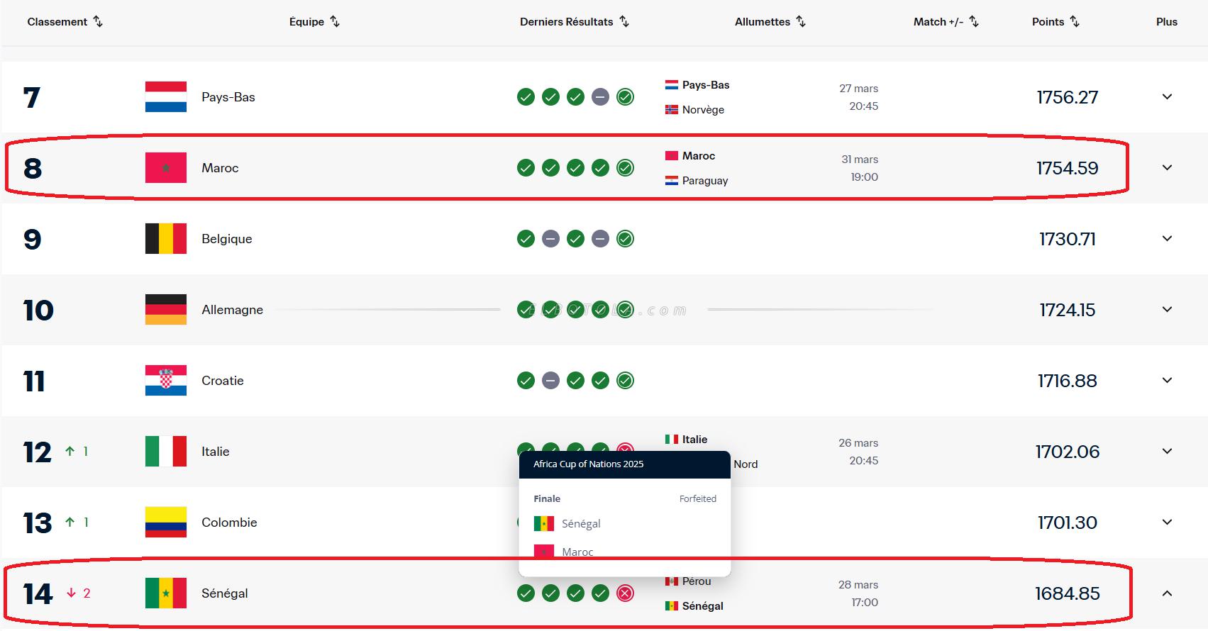 وأظهر التحديث الأخير على موقع "فيفا"، تراجع منتخب السنغال إلى المركز 14 عالميًا، بعدما كان يحتل المرتبة 12 في التصنيف الخاص بشهر يناير، مع انخفاض في رصيده من النقاط، في المقابل استفاد المنتخب المغربي من هذا القرار، حيث رفع من مجموع نقاطه دون أن يغير مركزه، ليستقر في المرتبة الثامنة عالميًا.