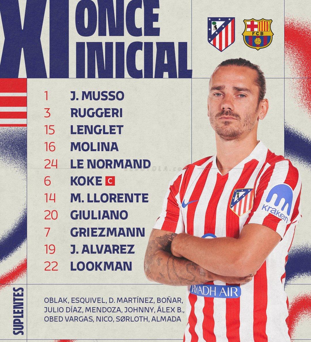 * تشكيلة أتلتيكو مدريد: موسو - روجيري، لونغلي، مولينا، لو نورمون - كوكي، لورينتي، سيميوني - غريزمان، لوكمان، ألفاريز.