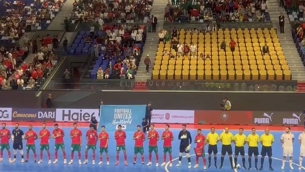 بشعار الله الوطن الملك.. النشيد الوطني يهز جنبات قاعة مولاي عبد الله قبل مباراة المغرب وإسبانيا 🇲🇦